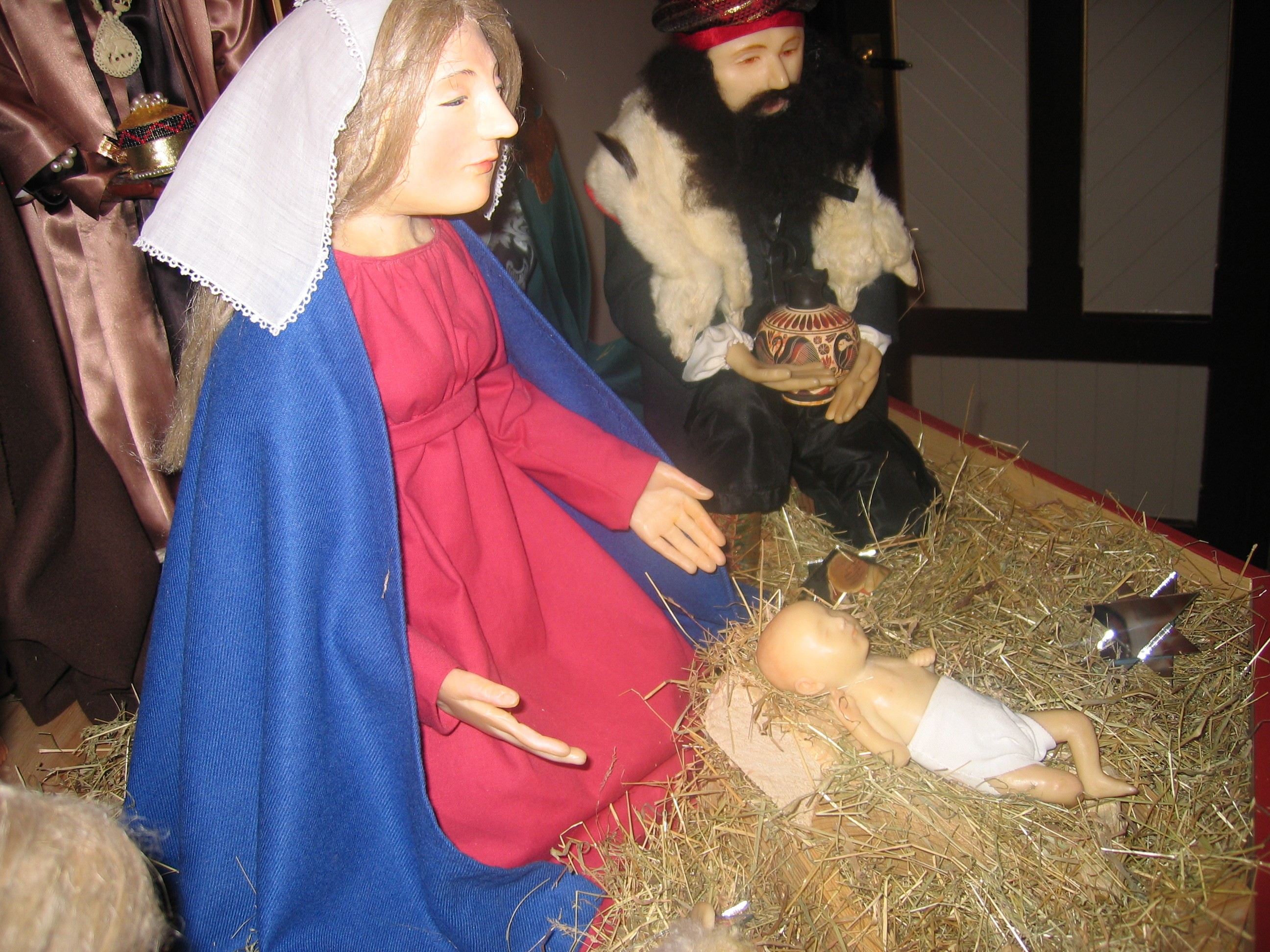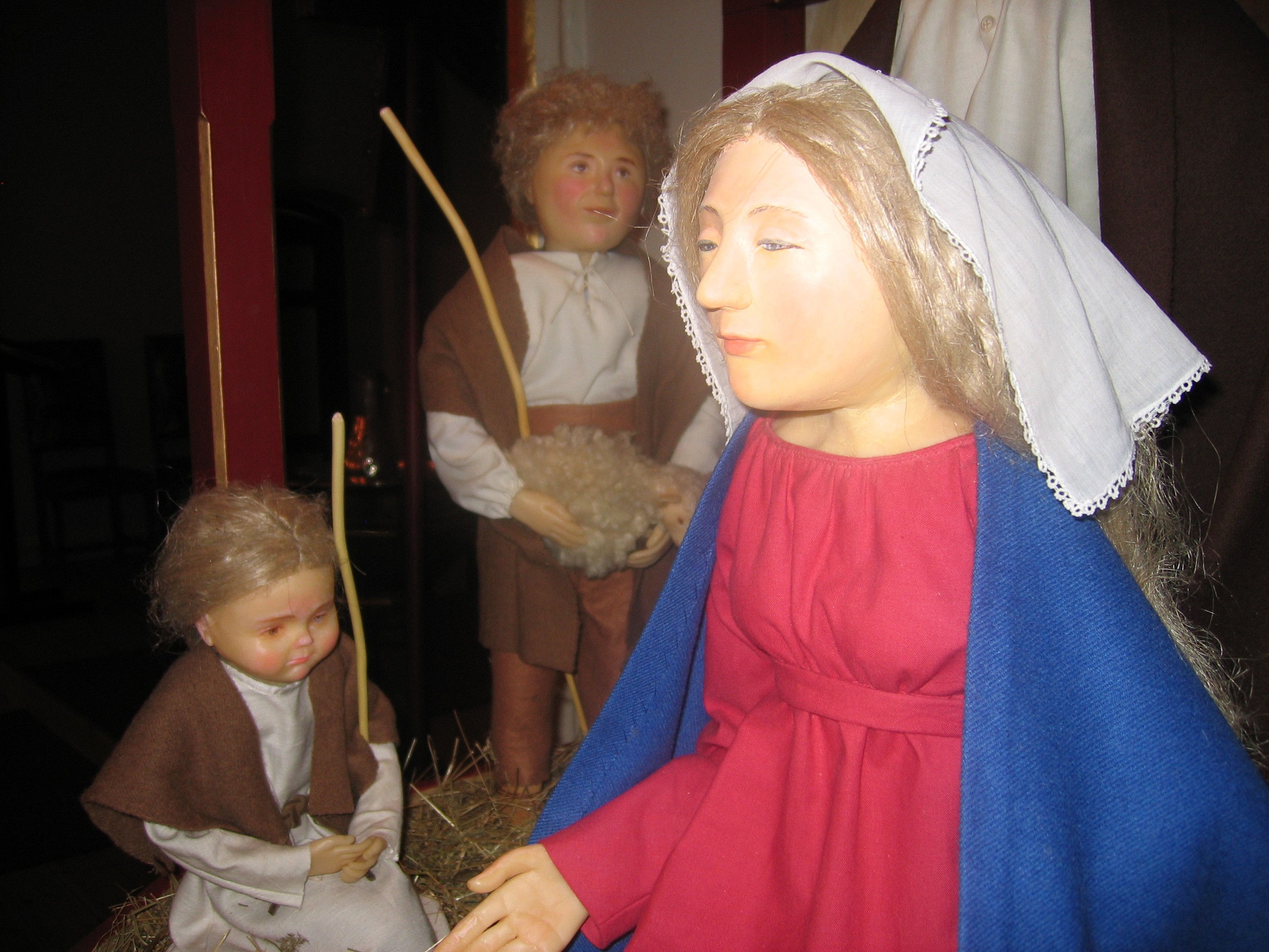 Den første figuren jeg prøvde å lage var Maria. Jeg kontaktet Sigrid Holme som er dyktig både til skreddersøm og til gyllenlær. Vi fikk til et kreativt samarbeid. Menighetsrådet bevilget 10 000 kr til materialer, og Sigrid og jeg dro på jakt etter vakre stoffer. Figurene ble til ved hjelp av ståltråd og treverk surret med tøyremser. Til modelleringen av figurene brukte jeg Cernit, en masse som ble herdet i stekeovnen. Etterpå ble de malt, linhår limt på og klær sydd. Sigrid laget skinnende støvler og flotte drakter til alle. Vi fikk i gave smykker, små hermeliner og gamle kniplinger.