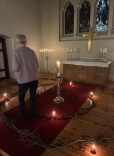 I midten av koret i kirken vil det store lyset stå. Vandringsveien, markert som en spiral med tørre bare kvister, leder oss fram til lyset. Der kan vi tenne våre lys fra det store lyset, som vi så setter ned langs veien når vi går veien tilbake. Vårt lille lys er satt i et eple, også det er vakkert og sterkt symbol.