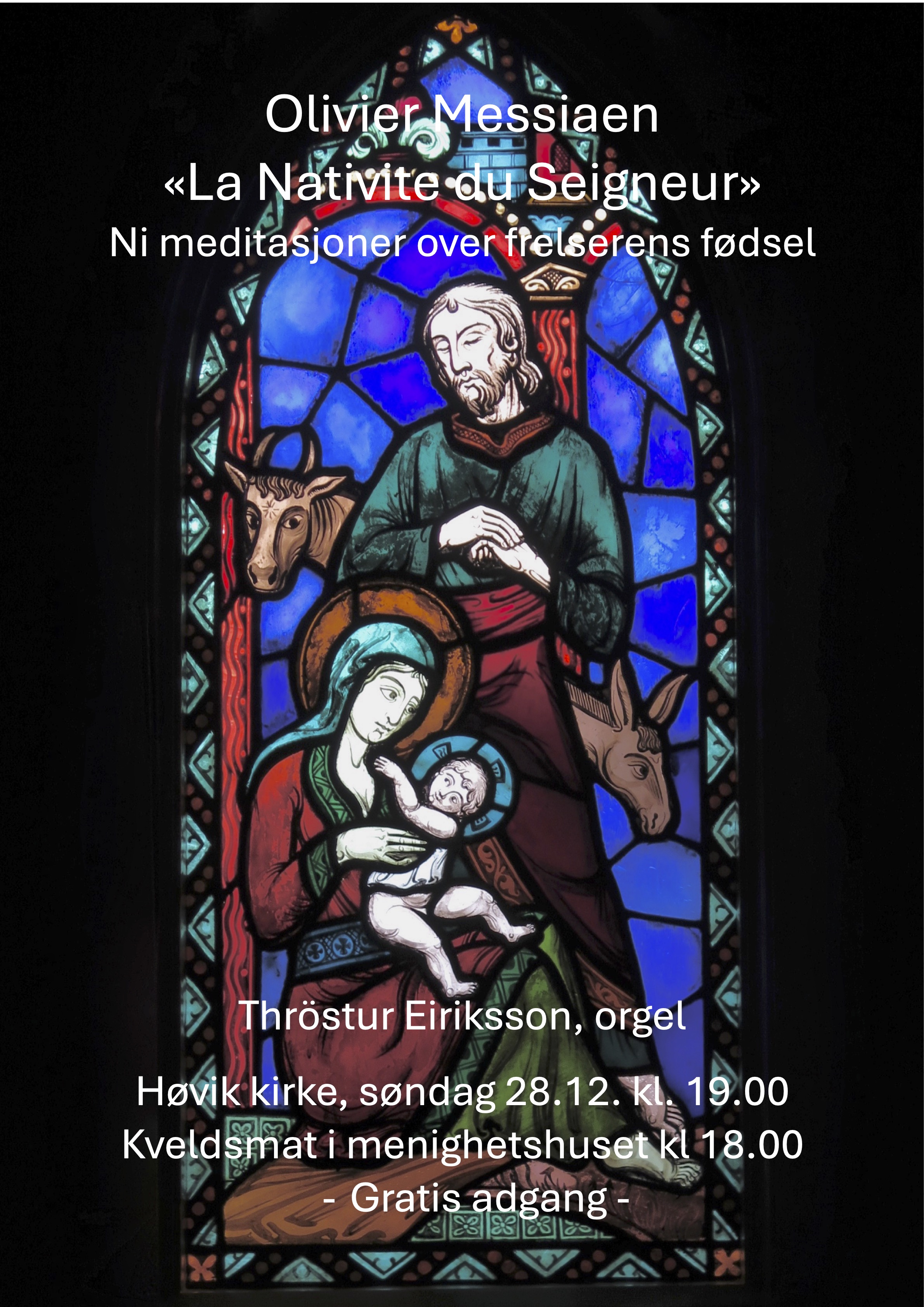 Dette verket - Ni meditasjoner over frelserens fødsel - for orgel, skrev Olivier Messiaen i 1935 - for 90 år siden - da han kun var 26 år gammel. Konserten starter 28.12. kl. 19.00. Fra kl. 18.00 er det kveldsmat i menighetshuset.